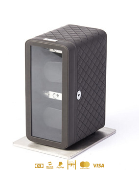 Estuche rebobinador (Watch Winder), con capacidad para 2 relojes independientes, fabricado en acero inoxidable rodizado, recubierto en piel de bovino y despunte en color negro hecho a mano con interior en gamuza. Puerta con ventana de cristal templado y cerradura de seguridad además de compartimiento para baterías.