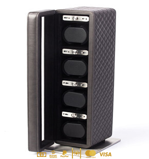 Estuche rebobinador (Watch Winder), con capacidad para 4 relojes independientes, fabricado en acero inoxidable rodizado, recubierto en piel de bovino y despunte en color negro hecho a mano con interior en gamuza. Puerta con ventana de cristal templado y cerradura de seguridad.