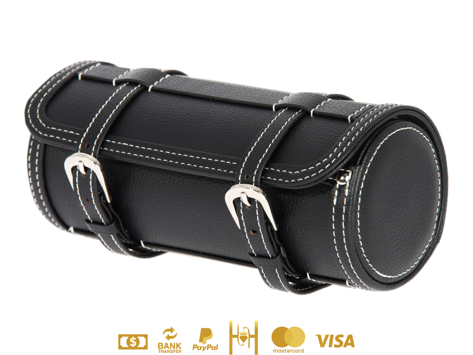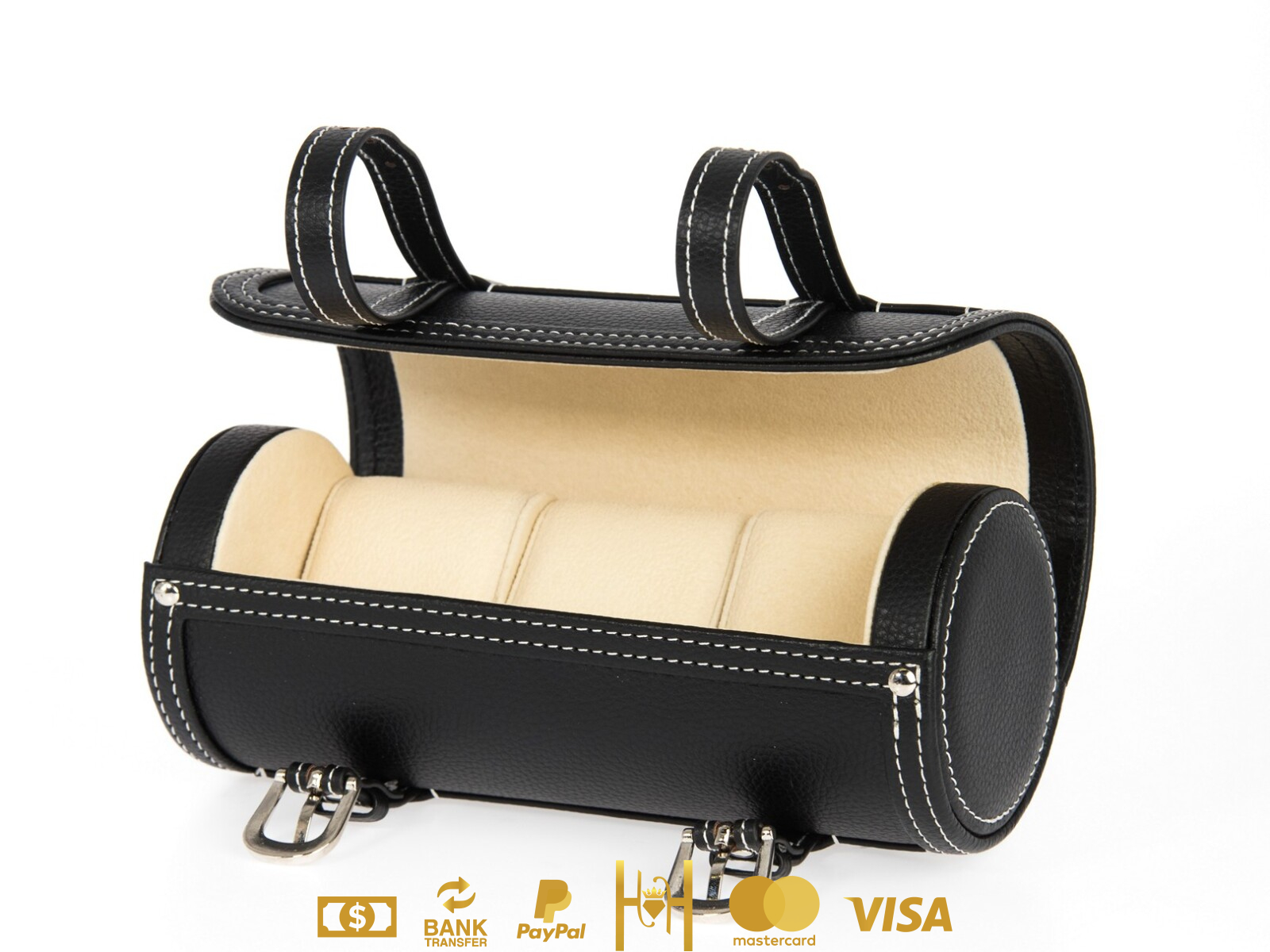 Estuche viajero de almacenaje con capacidad para 3 relojes fabricado en piel de bovino y pespunte color blanco con interior en gamuza color negro con cerradura de cinturón