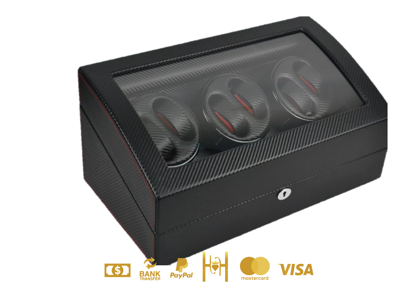 Rebobinador (Watch Winder) en madera terminado en PU de alta densidad en Fibra de Carbono con interior en PU de alta densidad en Fibra de Carbono y detalles en color Rojo, con ventana de acrílico con capacidad para 6 relojes en movimiento y 6 de almacenaje. Electrico de 3 motores con 4 diferentes ciclos de programacion amigables al uso. Incluye Luz de LED en su interior, adaptador de corriente A/C, franela limpiadora, instructivo, funda y caja protectora. Tambien puede operar con baterias tipo «C» (no incluidas).